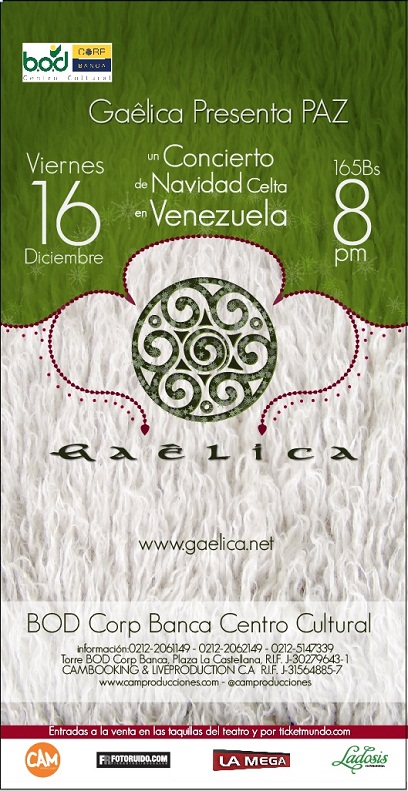 “PAZ Un Concierto de Navidad Celta en Venezuela” es un espectáculo musical y artístico único en su estilo, una celebración de unidad y alegría para toda la familia a través de un hermoso repertorio de aguinaldos venezolanos y los más famosos villancicos internacionales. El álbum navideño será totalmente interpretado en vivo junto a grandes músicos e invitados especiales para garantizar al público asistente el calor de hogar, el regocijo y la felicidad características de estas fiestas decembrinas. “PAZ Un Concierto de Navidad Celta en Venezuela” es el regalo de GAELICA para todo el país, es su forma de desear una feliz navidad y un prospero año nuevo 2012.