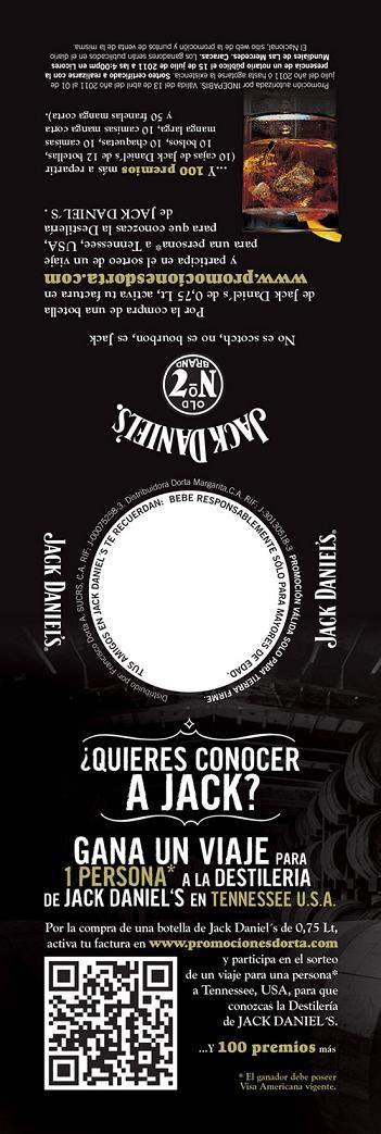 Sólo debes adquirir una botella de Jack Daniel´s de 0,75 Lt., hasta el 30 junio y activar tu factura en el site www.promocionesdorta.com y podrás obtener un viaje para una persona con todos los gastos pagos a la Destilería de Jack Daniel´s en Tennessee, Estados Unidos.