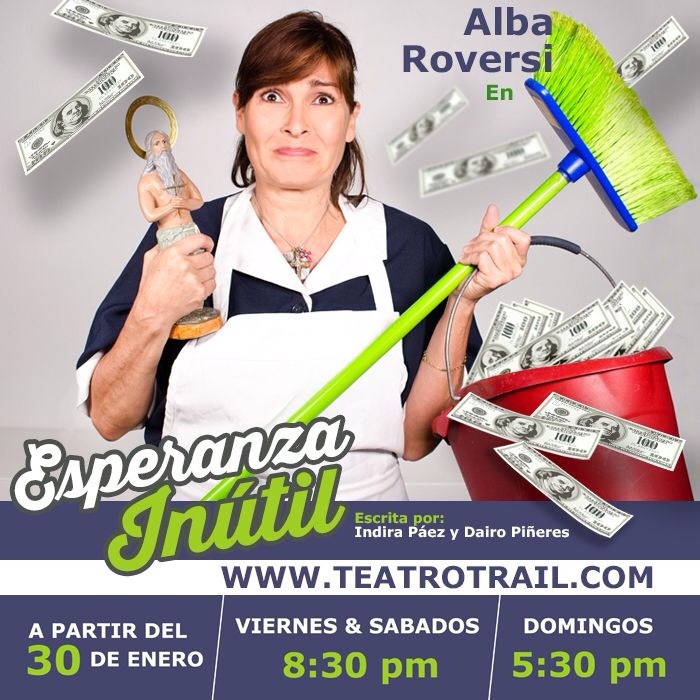 ALBA ROBERSI, actualmente se prepara para su regreso estelar en las tablas, de la sala Catarsis, con el monólogo «Esperanza Inútil», de los autores Indira Páez y Dairo Piñeres. Logrando con esta pieza teatral, su propia producción y dirección; y de la mano en co-producción con Marisol Correa, Directora del Teatro Trail y Catarsis.