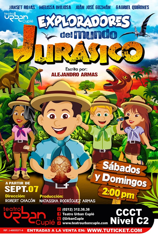 Este próximo sábado 07 de septiembre el Teatro Urban Cuplé del CCCT, Nivel C2 se convertirá en mundo fantástico lleno de maravillas naturales que sorprenderá a toda la familia, con el gran estreno de la pieza infantil “Exploradores del Mundo Jurásico” una obra original de Alejandro Armas bajo la dirección general de Robert Chacón que estará a la disposición del público todos los sábados y domingos a las 2:00pm.