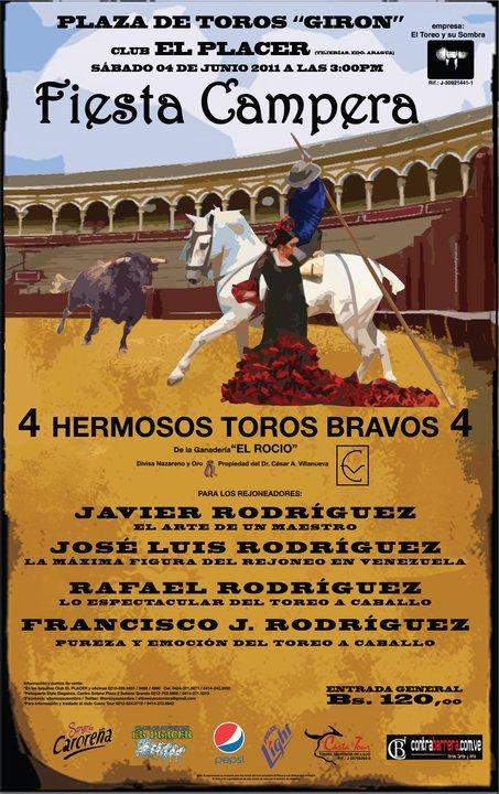 Cuatro hermosos toros de la ganadería venezolana «El Rocío», perteneciente al doctor César Alexis Villanueva, para: DON JAVIER RODRIGUEZ (el arte de un Maestro); JOSE LUIS RODRIGUEZ (nuestra máxima figura del rejoneo en Venezuela); RAFA RODRIGUEZ (lo espectacular del Toreo a Caballo); y FRANCISCO JAVIER RODRIGUEZ (pureza y emoción del atoreo a caballo, triunfador de las Ferias del Sol de Mérida y de la Plaza con más solera de América, «ACHO» en Lima, Perú).