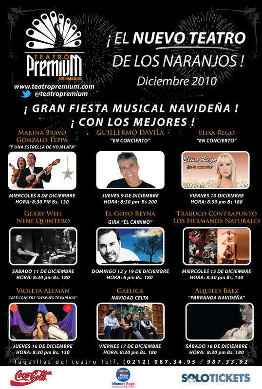 El teatro Premium Los Naranjos se complace en invitarlos a su gran fiesta NAVIDEÑA musical para el cierre del año 2010. El teatro Premium ha preparado para el cierre del año una gran Fiesta Musical con una variedad de artistas de altísima calidad, que prometen encender las fechas decembrinas con su energía y talento, Jazz, Boleros, Humor, Música tradicional navideña, Flamenco, Rock y Parrandas… Una mezcla de sonidos que durante 10 días llenarán de magia y alegría decembrina el maravilloso y exclusivo espacio del Teatro Premium, donde el espectador encontrará un ambiente cálido y cercano a sus artistas… UNA PROGRAMACIÓN DE LUJO: Miércoles 8: Marina Bravo y Gonzalo Teppa con “Una estrella de hojalata” , Jueves 9:Guillermo Dávila en “Concierto”, Viernes 10: Elisa Rego en “Concierto”, Sábado 11: Gerry Weil y Nené Quintero, Domingos 12 y 19: El Goyo Reyna, Miércoles 15: Trabuco Contrapunto y Los Hermanos Naturales, Jueves 16: Café Concert “Despues te explico” con Violeta Alemán, Viernes 17: Gaélica con una “Navidad Celta” y Sábado 18: Aquiles Báez y su “Parranda Navideña”.