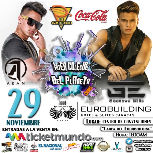 “El Intercolegial del Planeta” se realizará el próximo domingo 29 de noviembre desde las 11.00am, en El Centro de Convenciones “La Carpa” del Hotel Eurobuilding de Caracas. Las entradas se encuentran a la venta en la página web www.ticketmundo.com y el mismo día en la taquilla del evento.