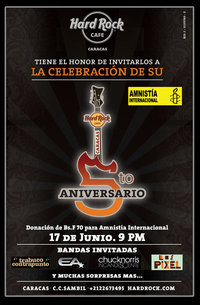 Una vez más y por quinto año consecutivo, Hard Rock Cafe Caracas celebra su Aniversario y en esta oportunidad, siempre cumpliendo con su compromiso social, se ha unido a Amnistía Internacional para apoyar la causa