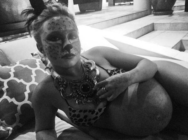 Sin embargo, la futura mamá no quiso usar un aburrido traje, sino se fue por un disfraz más original y un poco más sexy y su puso un bikini con estampado animal con el cual mostró su vientre de embarazada.