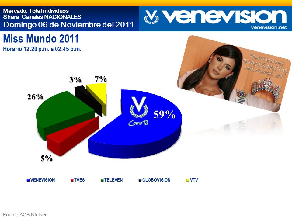 De acuerdo a las mediciones de la encuestadora AGB, Venevisión triunfó con la transmisión del certamen Miss Mundo,