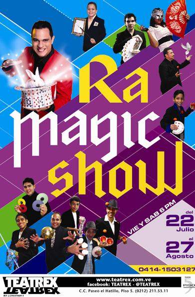 El Ra Magic Show se realizará desde el 22 de Julio hasta el 27 de Agosto, los días Viernes y Sábado, en TEATREX (Centro Comercial Paseo El Hatillo, piso 5) a las 6 pm. Las entradas están a la venta a través de la página web www.teatrex.com.ve y en las taquillas del teatro.