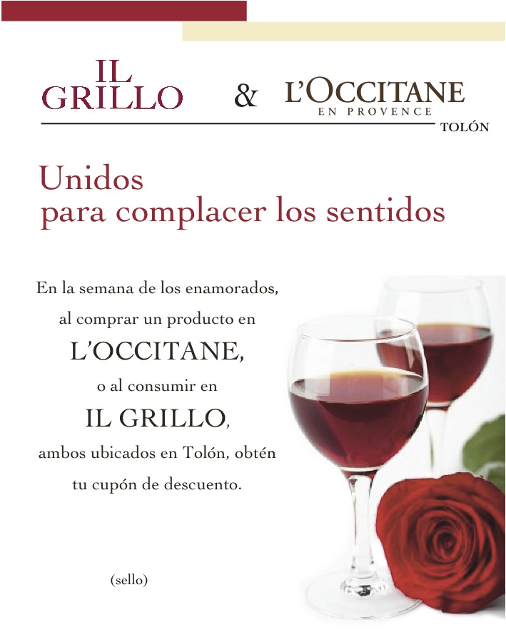 Es por eso que desde el 9 hasta el 17 de este mes, Il Grillo Tolón y L´Occitane regalan a los enamorados o a quienes celebran su amistad un cupón de descuento que permite disfrutar de una rebaja al degustar alguno de los deliciosos platos de la carta que ofrece Il Grillo Tolón o al comprar uno de los elegantes productos en L´Occitane Tolón. Este maravilloso regalo está vigente hasta el 14 de marzo, para los que celebren entre aromas y sabores el mes del Amor y la Amistad.