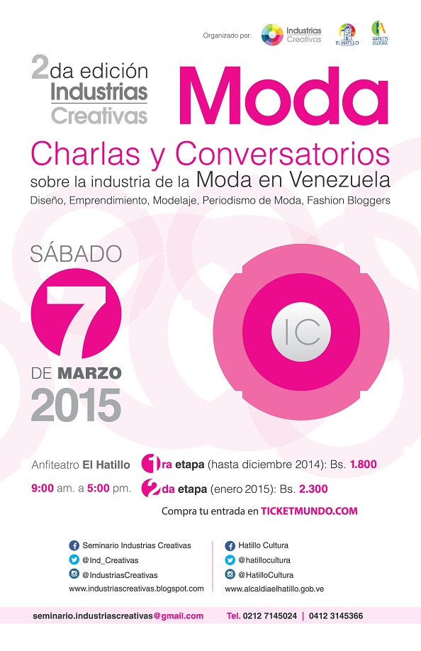 del sector moda en Venezuela, a adentrarse en los dinámicos procesos de diseño, producción, comercialización y promoción de la industria de la moda nacional e internacional, a través de la segunda edición de Industrias Creativas Moda, que se llevará a cabo el 7 de marzo de 2015, en el Anfiteatro El Hatillo, de 9am a 5:30pm.
