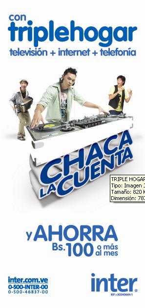 En sumatoria, Mendoza comentó que «la campaña `Chaca la cuenta´ es una invitación que realizamos a nuestros suscriptores que actualmente sólo tienen contratado uno o dos servicios con Inter, y al público general, a realizar el mismo ejercicio de estudio del mercado que desarrollamos en la compañía durante el año 2009, `sacar la cuenta´ de cuánto pagan en sumatoria por los tres servicios, en comparación con lo que podrían ahorrar si los afiliaran todos con el Triple Hogar de Inter».