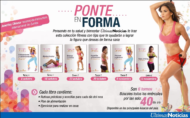 En esta oportunidad Últimas Noticias establece alianza de circulación de esta interesante colección con: Diario Los Andes, El Tiempo y Notitarde. No te pierdas de la Colección «Ponte en forma» a partir del 09 de octubre en tu kiosco favorito y en los centros de servicios de la Cadena Capriles. Por tan solo 40 Bs.