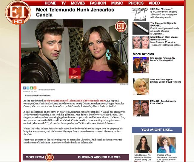 Miami, 03 de Noviembre 2011.- La joven estrella de la música y la televisión Jencarlos Canela empieza a conquistar la televisión americana, gracias a su carisma e indiscutible talento, el cual ya está siendo reconocido por importantes cadenas de televisión de Estados Unidos, como es el caso de CBS, quienes a través de su popular programa Entertainment Tonight le realizaron una divertida entrevista en el marco de un especial denominado «The Latin Hunks».