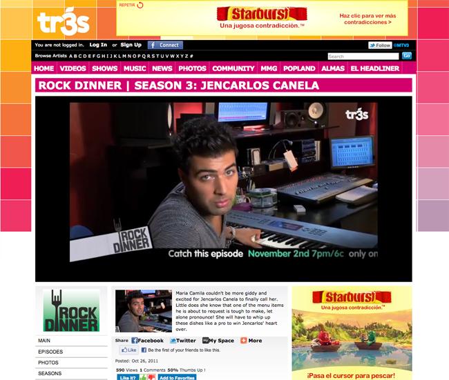 Asimismo, el día de ayer y simultaneamente, la reconocida cadena musical MTV3 estrenó un nuevo episodio de su programa «Rock Dinner», en donde el invitado especial fue el intérprete del tema «Baila Baila», quien tuvo la oportunidad de elegir un exquisito menú, el cual fue preparado por una de sus admiradoras, con quien posteriormente compartió una deliciosa cena en compañia de su inseparable guitarra con la que le interpretó el tema «Llévame Al Cielo», incluido en su segunda producción discográfica «Un Nuevo Día».