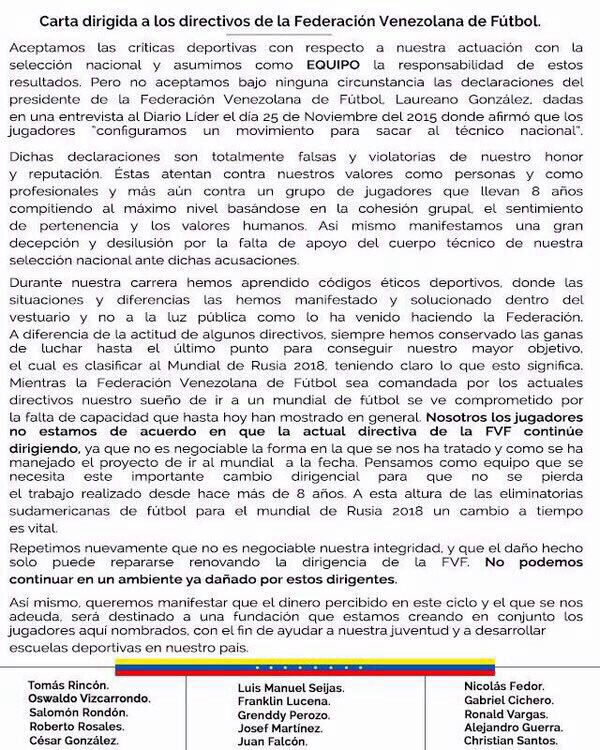 Aceptamos las críticas deportivas con respecto a nuestra actuación con la selección nacional y asumimos como EQUIPO la responsabilidad de estos resultados. Pero no aceptamos bajo ninguna circunstancia las declaraciones del presidente de la Federación Venezolana de Fútbol, Laureano González, dadas en una entrevista al Diario Líder el día 25 de noviembre de 2015 donde afirmó que los jugadores “configuramos un movimiento para sacar al técnico nacional”.