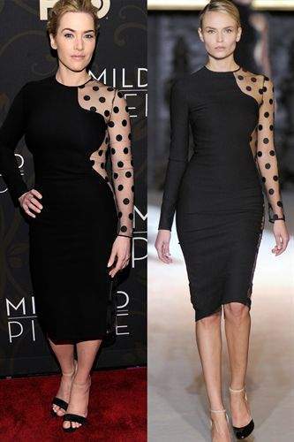 El acierto asegurado consistía en un vestido que se ceñía a cada rincón del cuerpo de Winslet, en color negro, manga larga, cuello cerrado y largo por debajo de las rodillas acabando en un corte recto.