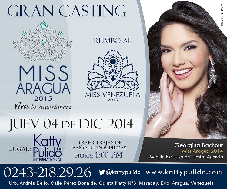 Las aspirantes, según explicó Katty Pulido, deberán llenar los siguientes requisitos: edad comprendida entre los 17 y 25 años, estatura mínima de 1.68 mts, llevar un traje de baño de dos piezas, zapatos de tacón alto y poco maquillaje, y presentarse en la sede de la Agencia de Modelaje Katty Pulido, ubicada en la urbanización Andrés Bello, calle Pérez Bonalde No. 3, en Maracay, o comunicarse por el teléfono 0243-2182926, y no es requisito ser aragüeña de nacimiento.
