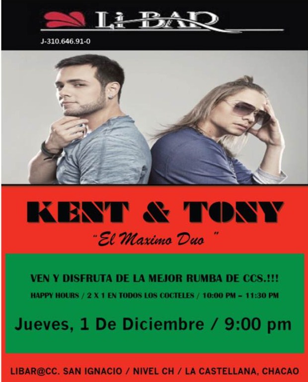 LIBAR inicia la navidad 2011 celebrando con sus asiduos y nuevos visitantes al ritmo de »El máximo dúo» KENT y TONY este jueves 1 de diciembre a partir de las 9pm en el nivel Chaguaramos del C.C. San Ignacio- Caracas.