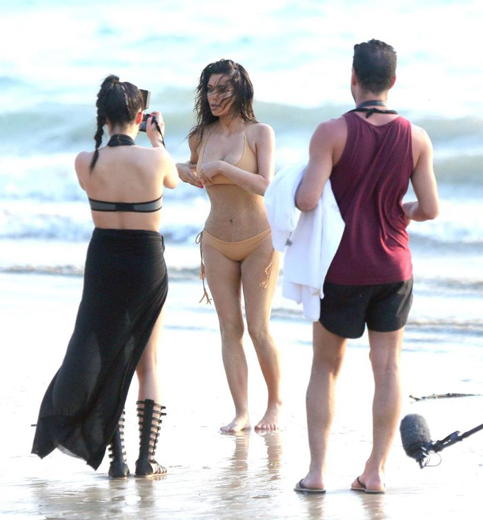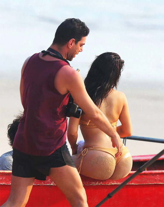 Las imágenes fueron captadas por un paparazzi y se muestra sentada de espaldas en el borde de un bote rojo y otra acostada boca abajo a la orilla del mar.