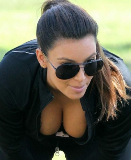 Kim Kardashian sorprendió a sus fans con un sorprendente escote que dejó entrever parte de sus senos mientras se agachó a recoger una pala.