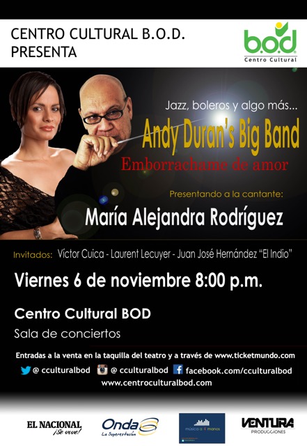 Glamour, nocturnidad y buena música se mezclan el próximo 6 de noviembre en el Centro Cultural BOD con Emborráchame de amor, gala que combinará el grandioso sonido de Andy Durán Big Band con la dulce voz de la cantante María Alejandra Rodríguez.
