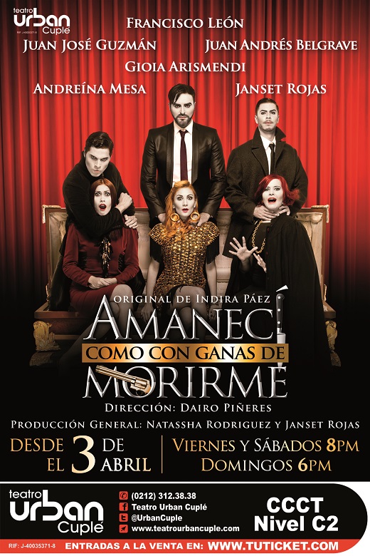 Caracas, 6 de marzo de 2015.- Ya se encuentra en la cartelera teatral caraqueña, en la sala 1 del Teatro Urban Cuple del CCCT una de las piezas más destacadas del teatro contemporáneo venezolano, Amanecí como con ganas de morirme, de Indira Páez. La pieza que toca el delicado tema de la muerte a través del humor más negro y delirante, llega para quedarse en las tablas caraqueñas, bajo la dirección del aclamado director Dairo Piñeres. En esta oportunidad el elenco está conformado por Francisco León, Gioia Arismendi, Juan Andrés Belgrave, Janset Rojas, Juan José Guzmán y Andreína Mesa.