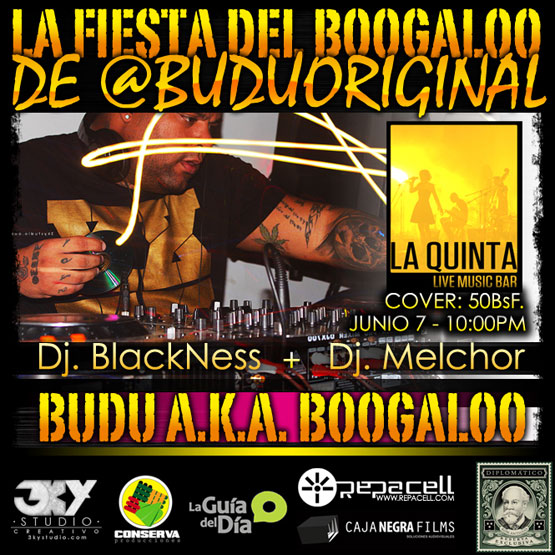 Así que ya saben a celebrar junto a BUDÚ el Primer Aniversario de la FIESTA BOOGALOO, este jueves 07 de Junio en “LA QUINTA BAR” de las Mercedes 10:00pm Cover Bs.50 bajo la producción de CAJA NEGRA FILMS y CONSERVA PRODUCCIONES.