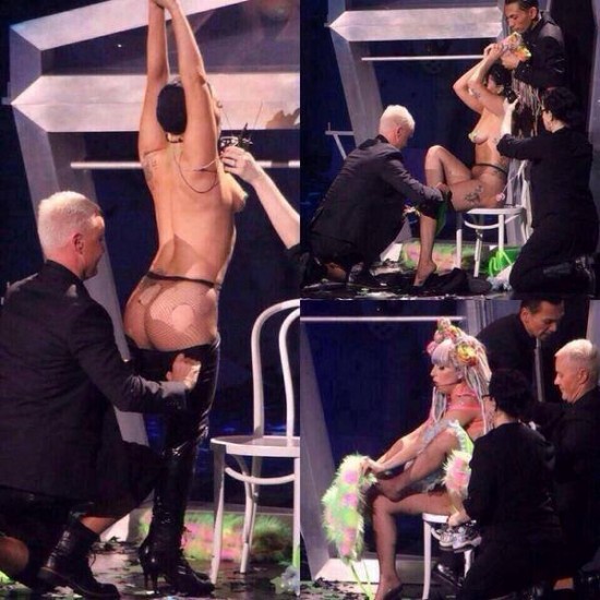 Lady Gaga fue ayudada por tres asistentes de vestuario a quedarse desnuda, para luego colocarse una peluca y un peculiar vestido.
