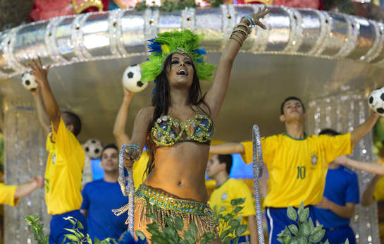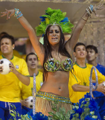 El tema del carro alegórico que cerrará el desfile es ‘Copa del mundo en Manaus’ ciudad que será sede del Mundial de Fútbol Brasil 2014, por lo que parece más que adecuado que uno de los rostros y los cuerpos más populares de la última edición de la competición, Larissa Riquelme, haga acto de presencia en la carroza.