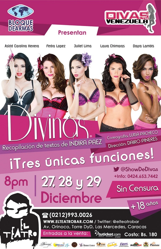 Divinas ha sido la pieza teatral más exitosa del 2012, y de eso no queda la menor duda. Una primera temporada con funciones totalmente agotadas en Caracas, una gira nacional repleta en cada una de sus presentaciones, una docena de portadas de revistas y más de quinientas publicaciones en medios impresos confirman que las “Divas de Venezuela” llegaron para quedarse.