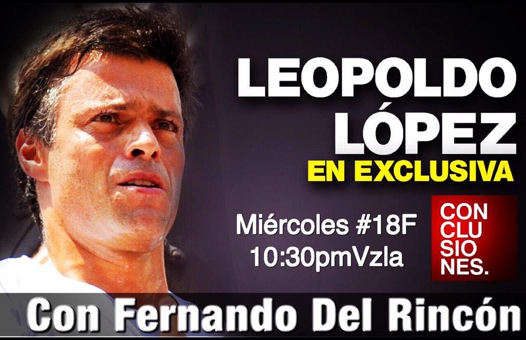 Este miércoles 18 de febrero a las 10.30 p.m., CNN en Español transmitirá una entrevista exclusiva realizada por el periodista Fernando del Rincón con el dirigente opositor venezolano, Leopoldo López, al cumplirse un año de su encarcelamiento, acusado de generar con su discurso acciones violentas tras una marcha antigubernamental en la que tres personas perdieron la vida en febrero de 2014.