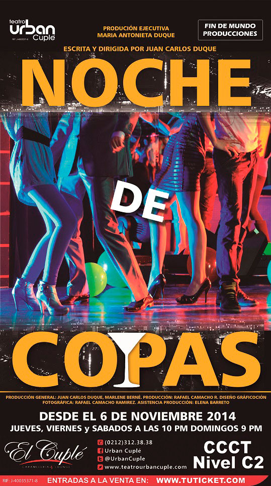 Un montaje diseñado tanto para escenarios teatrales, como para espacios no convencionales, como el que fue escogido para su estreno oficial: El Cuplé, la sala lounge and Bar del Teatro Urban Cuplé, en donde el público puede presenciar el espectáculo mientras disfruta de un trago, sin dudas, un lugar ideal para una ¨Noche de Copas¨.