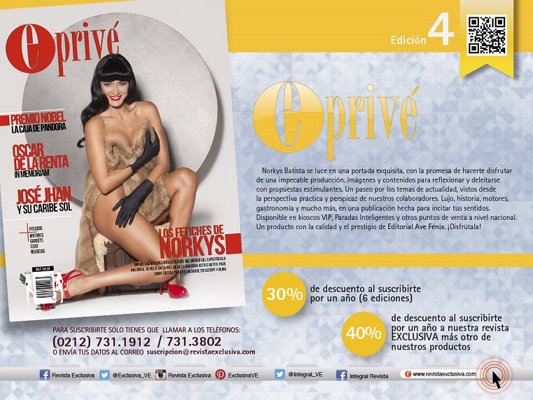 La cuarta edición de la revista E-Privé trae en su portada a la bellísima y talentosa Norkys Batista, quien nos da una sesión de fotos exclusiva en donde confiesa sobre sus gustos y fetiches. Además de la exquisita portada en donde Norkys personifica una seductora vedette, este número también trata lo último en materia de gastronomía, lujo, historia y motores ¡Una edición para deleitarse!