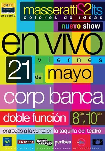 La banda electrónica venezolana Masseratti 2lts estará presentádose en vivo el viernes 21 de Mayo en la sala de conciertos del Centro Cultural Corp Banca. Se ofrecerán 2 funciones seguidas