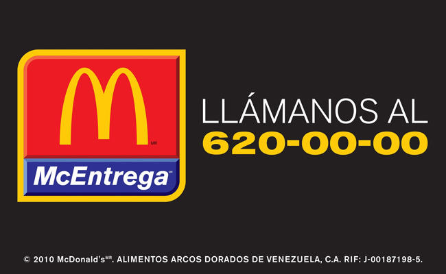 Gracias al nuevo servicio McEntrega con una llamada telefónica es posible disfrutar de la variedad y calidad de los productos de McDonald’s a domicilio. Con sólo llamar al 620.00.00, en Caracas, se realiza el pedido y tras una espera de máximo 40 minutos se tendrán los productos en la casa u oficina.