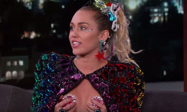 Miley Cyrus apareció como invitada en la emisión del 27 de agosto de 2015 del programa ‘Jimmy Kimmel Live’ y llamó la atención de todos los que la vieron gracias a su peculiar y colorido atuendo , al igual que por no haberse puesto una blusa y tampoco un sostén .