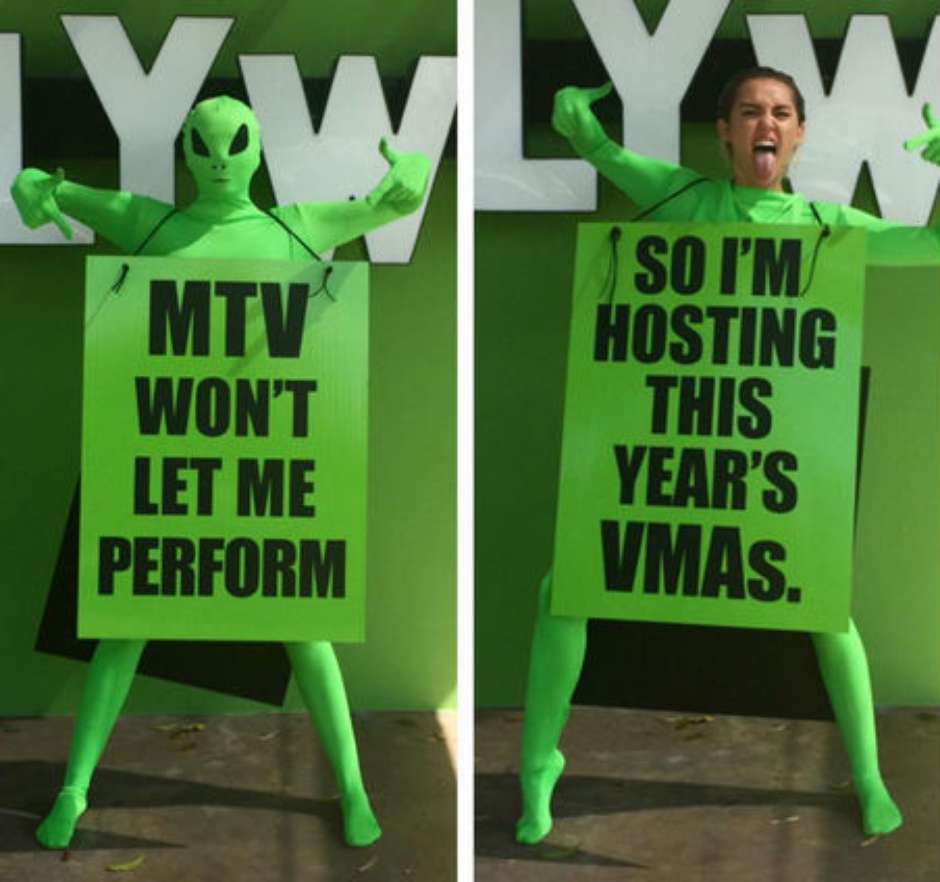 «MTV no me dejará actuar, así que seré la anfitriona este año de los VMA», señaló la también actriz en un letrero que portó en dichas imágenes. Esta información fue confirmada después por representantes de Cyrus y del canal de música, de acuerdo con la fuente.