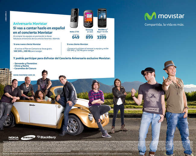 Caracas, 1° de marzo de 2011.- Movistar cumple 6 años en Venezuela y lo celebra a lo grande con la Promoción Aniversario que ofrece descuentos en telefonía móvil, planes, entretonos gratis, sorteos y un concierto exclusivo para sus clientes con Chino y Nacho, Servando y Florentino y Caramelos de Cianuro que se realizará el 14 de abril en el Anfiteatro Sambil en Caracas.
