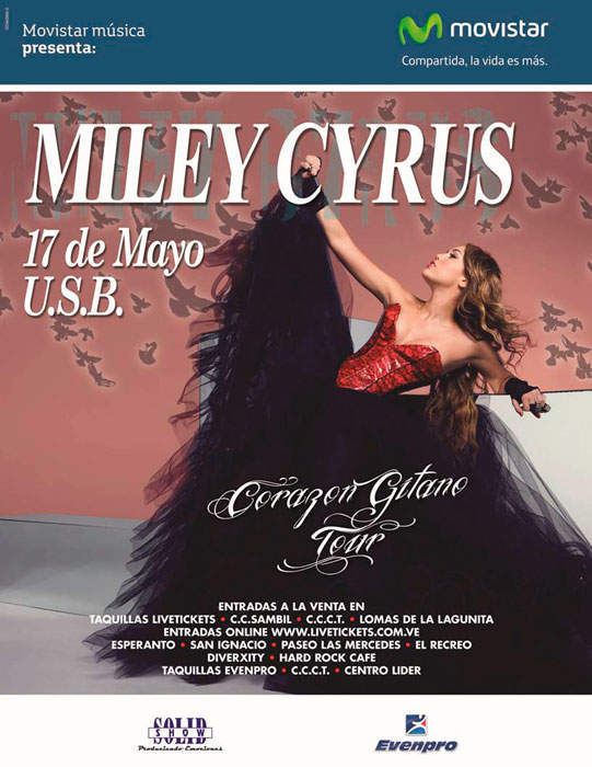 Caracas, 29 de marzo de 2011.- Del 29 de marzo al 2 de abril los miembros del Club Movistar obtendrán un 20% de descuento al adquirir un máximo de 2 entradas para disfrutar del concierto que la estrella juvenil del momento, Miley Cyrus, ofrecerá el 17 de mayo en el estadio de fútbol de la USB en Caracas, en un evento patrocinado por Movistar Música y co-producido por Evenpro y Solid Show.