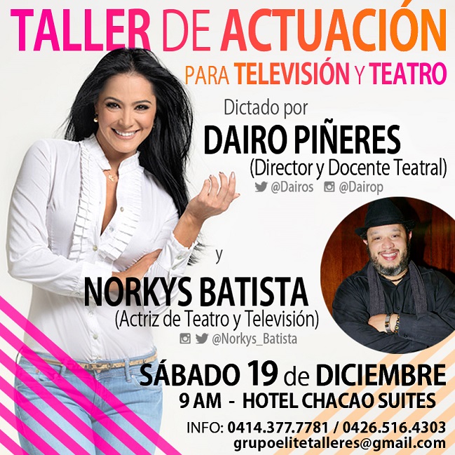 La reconocida y polifacética actriz de teatro y TV, Norkys Batista, y Dairo Piñeres, director y docente teatral, llevarán a cabo el sábado 19 de Diciembre su próximo “Taller de Actuación para Televisión y teatro”, el cual tiene como finalidad primordial, aproximar al participante a la confrontación con el hecho televisivo y teatral en sus lineamientos generales, a través del contacto y desarrollo de herramientas básicas dentro de las principales áreas de la formación dramática.
