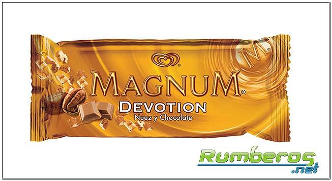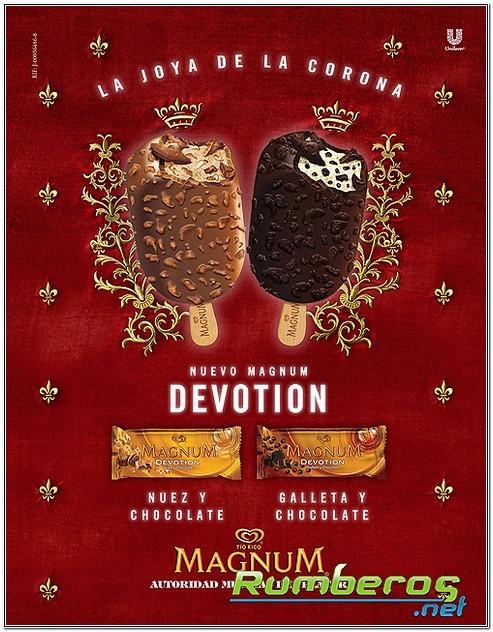 Los nuevos Magnum Devotion Nuez y Chocolate y Magnum Devotion Galletas y Chocolates desde ya se puede conseguir, a sólo 10,5 Bs.F., en todos los puntos de venta de Tío Rico; y vienen a sumarse a la variedad de paletas: Magnum Almendras, Magnum blanco, Magnum Praline, Magnum Alfajor, por supuesto, Magnum Clásico. Variedades que están dirigidas a un consumidor adulto contemporáneo que disfruta de los placeres sustanciosos y remarcables de la vida.