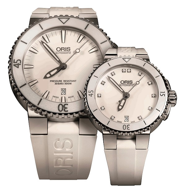 Cinco modelos estarán disponibles, cada uno con un distintivo toque femenino. Elija entre anillos superiores de cerámica o de acero y esferas lisas o con diamantes engastados, en blanco o negro. La pulsera se suministra en caucho flexible negro o blanco y es de fácil ajuste gracias a su hebilla plegable. Está también dotado del protector de corona característico de Oris, sujeto por los 3 tornillos habituales.