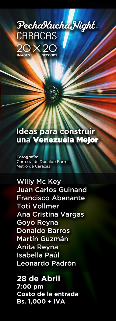 La segunda edición de Pechakucha Night llevará por título Ideas para Venezuela: iniciativas, proyectos y reflexiones para construir un país mejor. La cita será el jueves 28 de abril, a las 7:00 pm, en el Teatro de Chacao, que se encuentra en la avenida Tamanaco de El Rosal. Las entradas para esta única función tienen un costo de Bs.1000 + IVA y están a la venta en www.ticketmundo.com y las taquillas del teatro.