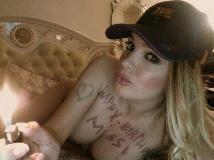 La Pulpo Vivi, conocida por sus pronósticos futbolísticos, posó completamente desnuda, y sobre su pecho, donde pronostica los resultados, escribió su mensaje de felicitación: «Happy Birthday Messi».