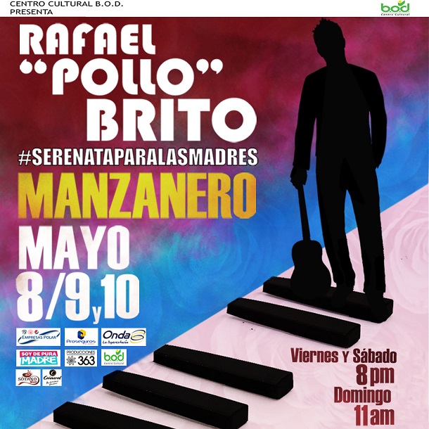 No te pierdas Rafael “Pollo” Brito #Serenataparalasmadres Armando Manzanero viernes 08 y sábado 9 a las 8:00 pm y domingo 10 a las 11:00 am en el Centro Cultural BOD.