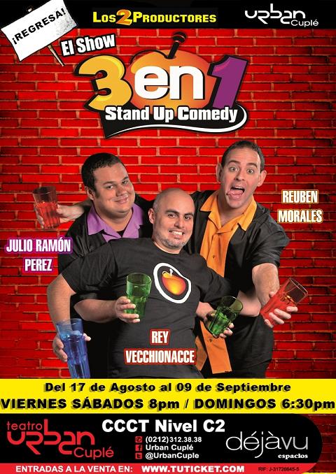 como la naranja, llamado Rey Vecchionacce (@ReyPelao) y otro bien nutritivo y redondo como una remolacha, llamado Julio Ramón Pérez (@JulioRamonPerez) vuelven a la escena con el más divertido coctel de humor: “3 en 1 Stand Up Comedy”a petición del público.