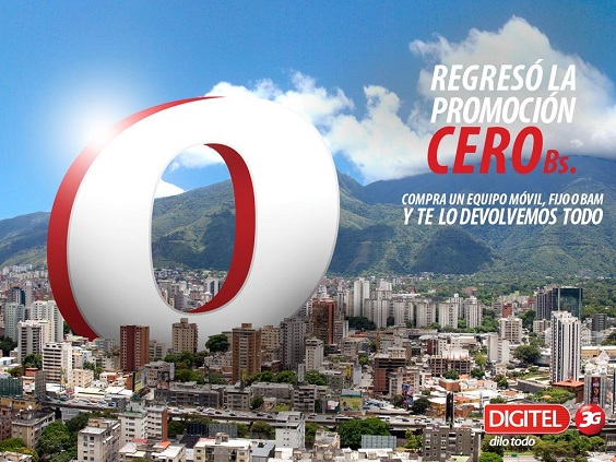 Digitel continúa ofreciendo a sus usuarios la mejor relación precio-valor del mercado de las telecomunicaciones en Venezuela, en esta oportunidad trae de nuevo la exitosa promoción Cero Bs. vigente hasta el 17 de septiembre de 2012 y que ofrece a sus usuarios nuevos y actuales equipos de telefonía Móvil, Fija y BAM a precios de promoción, con el beneficio de que los planes y servicios suscritos son gratis hasta por 5 meses.