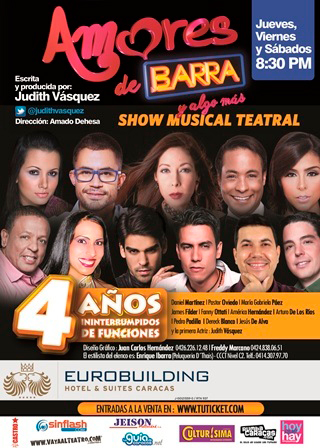 El Taquillero Show Musical Teatral “Amores de barra…y algo más”, inicia sus funciones habituales este Jueves 22 de Enero de 2015, para continuar entreteniendo al público en el “EUROBUILDING Hotel & Suites Caracas”.