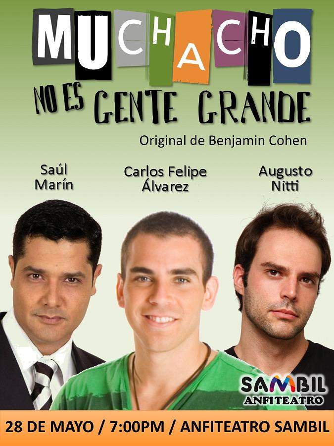 “Muchacho no es gente grande” es la historia de tres hombres que planean armar una fiesta descomunal en un apartamento de soltero, sin imaginarse que lo que iba a ser la mejor noche de sus vidas se convertirá en un disparatado desastre. “Chapo” (Saúl Marín), “David” (Carlos Felipe Álvarez) y “Leo” (Augusto Nitti) abrirán las puertas de un apartamento de soltero para que el público entre en el misterioso universo masculino, y se atreverán a mostrar sin censura la verdad que todas las mujeres quieren saber de los hombres.
