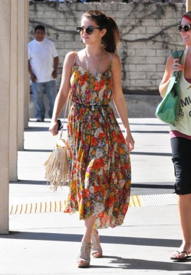 Selena Gomez lució un vestido floreado, el cual acompañó con unos zapatos de plataforma. Aunque hay rumores de coqueteos con algunos actores, la cantante parece feliz con su soltería.