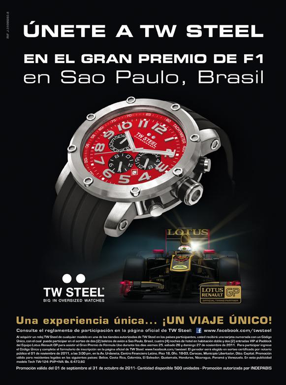 Con esta iniciativa, TW Steel propicia la ocasión perfecta para que todos los amantes de la Fórmula 1 sigan de cerca el Gran premio de Brasil. Si ya tienes un reloj de la firma no olvides registrar los datos en el Facebook TW Steel, Tú puedes ser el ganador.